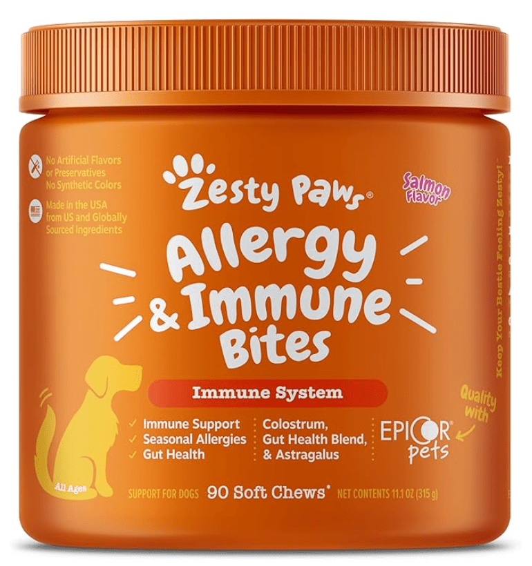 I discovered Zesty Paws Allergy & Immunity Bites recently, and now I give two to each of my dogs every day. It’s a treat that they enjoy and one that I know is packed with great ingredients such as colostrum, flaxseed, Astragalus root, and probiotics, to protect gut health and against seasonal allergies with histamine blockers. Click here to check it out.
