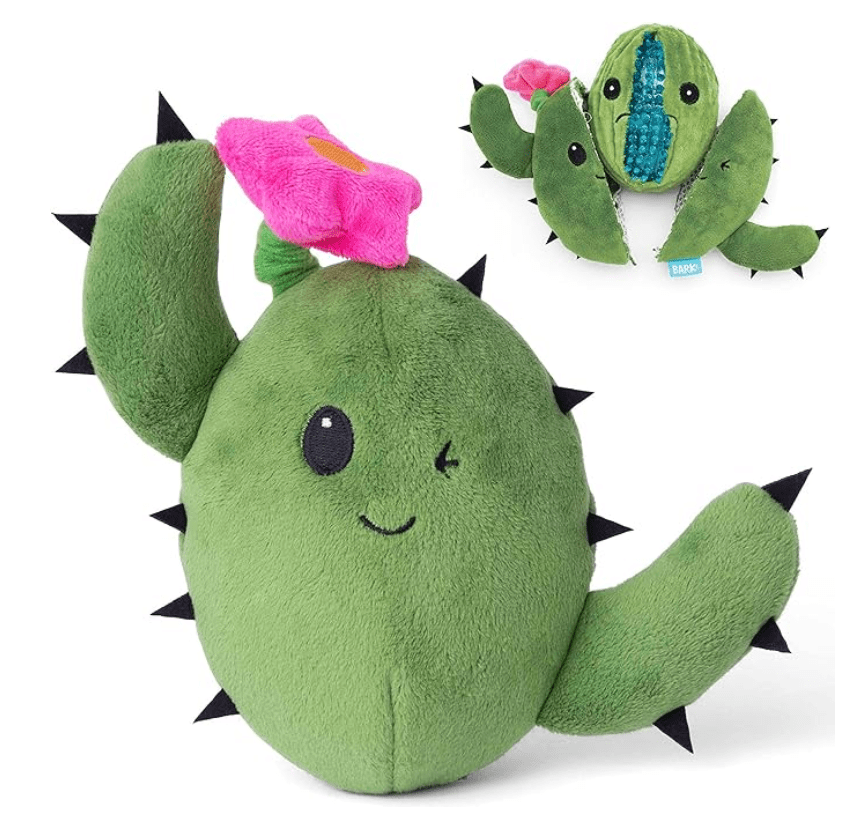 Meet Consuela the Cactus! This toy is designed to be destroyed (“rip in reveal”), with a smaller squeaker inside to surprise your pup and make for long lasting playtimes. Our puppies love this toy, and it’s bouncy, squeaky, and non-toxic! Click here or on the photo below to learn more or to purchase: