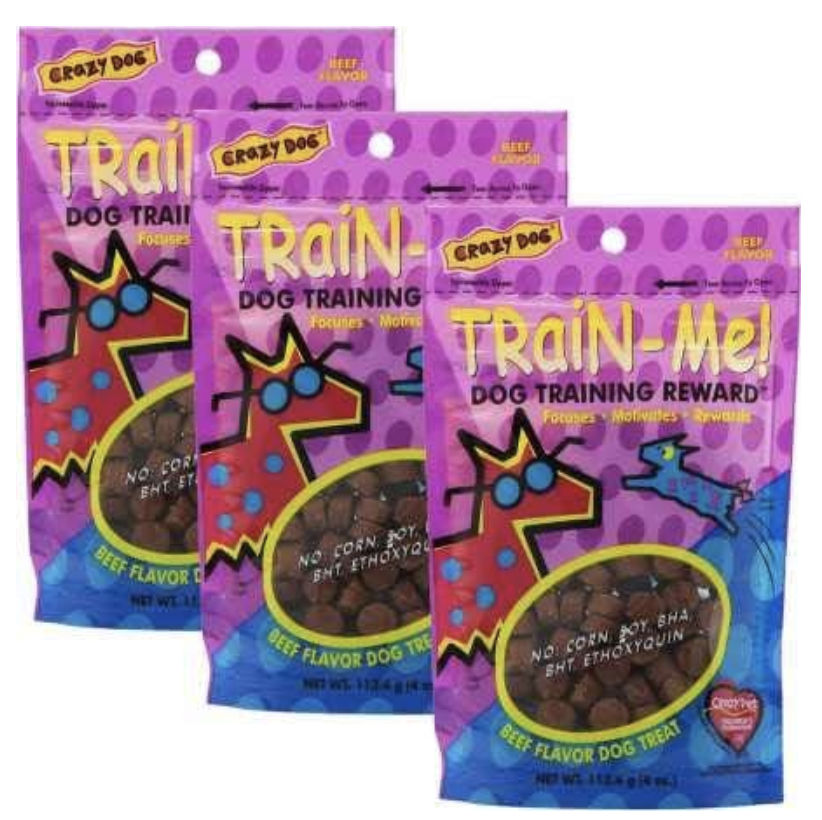 When your pup is an adult, Crazy Dog Train Me Treats are my favorite because they are small, very low-calorie, and dogs love them! My dogs will jump in circles for these! Get the three-pack because when you are doing a lot of training in in the first year, you’ll need them! They come out to about $6 per bag when you buy in bulk. Click here or on the photo below to learn more or to buy: