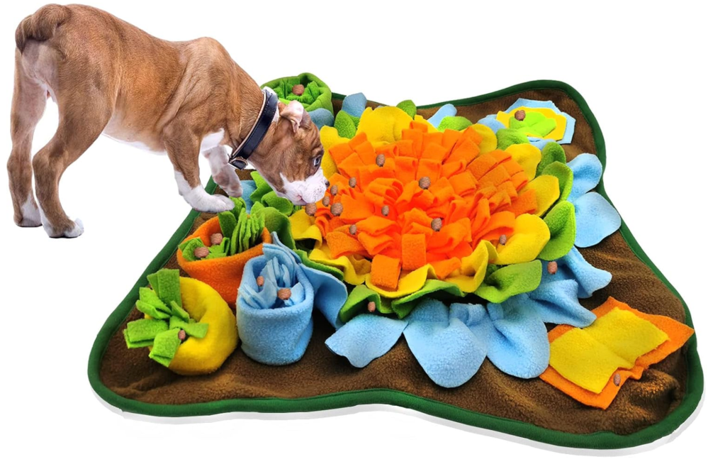 This Snuffle Mat is a great way to SLOW down your puppy’s or dog’s mealtime. It’s my go-to for enrichment and mental stimulation. I timed my puppies’ breakfast with a regular bowl and they were done in less than a minute. With a snuffle mat, it takes them 10-13 minutes to finish a meal. Click here to view or on the photo below: